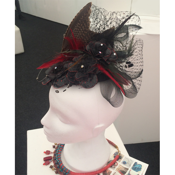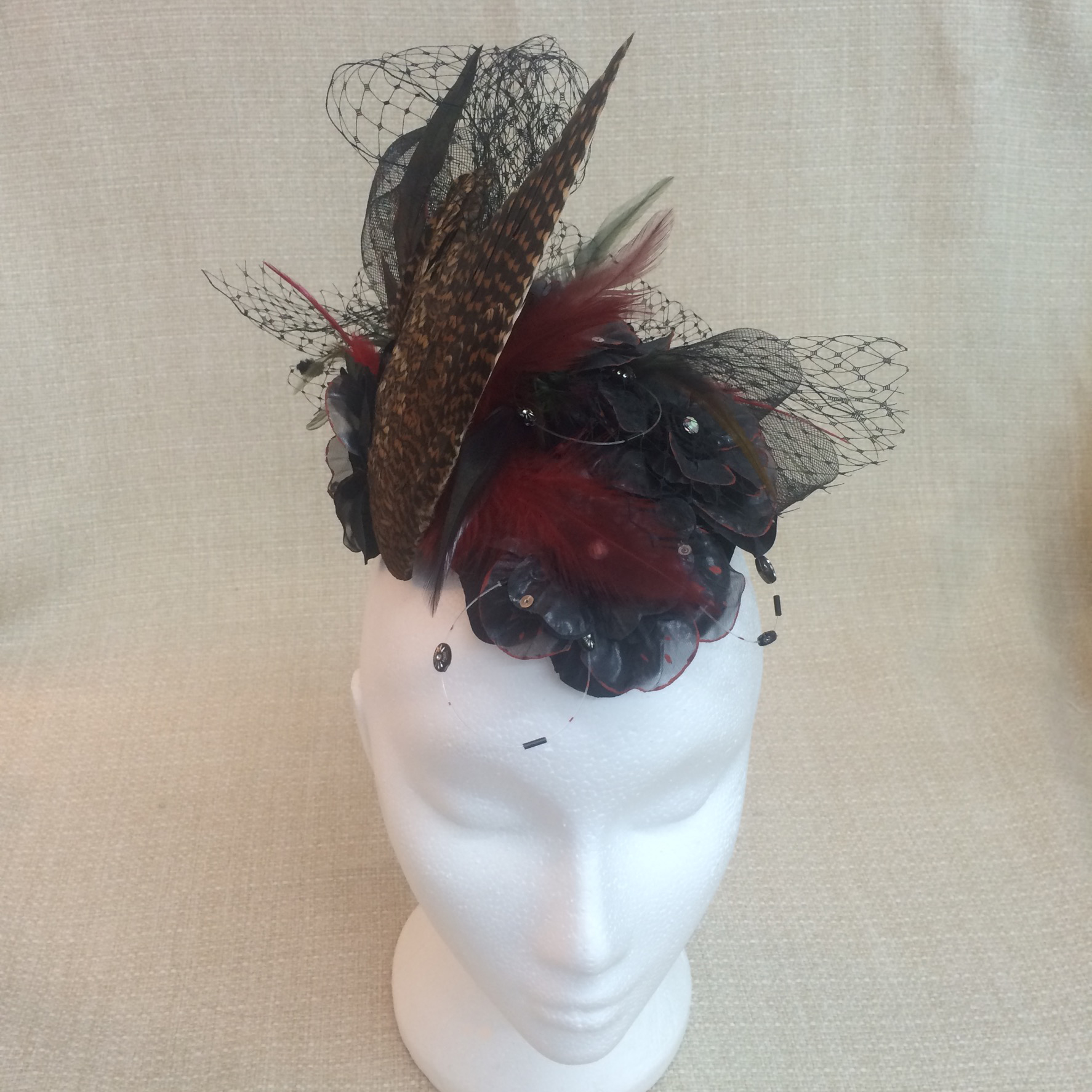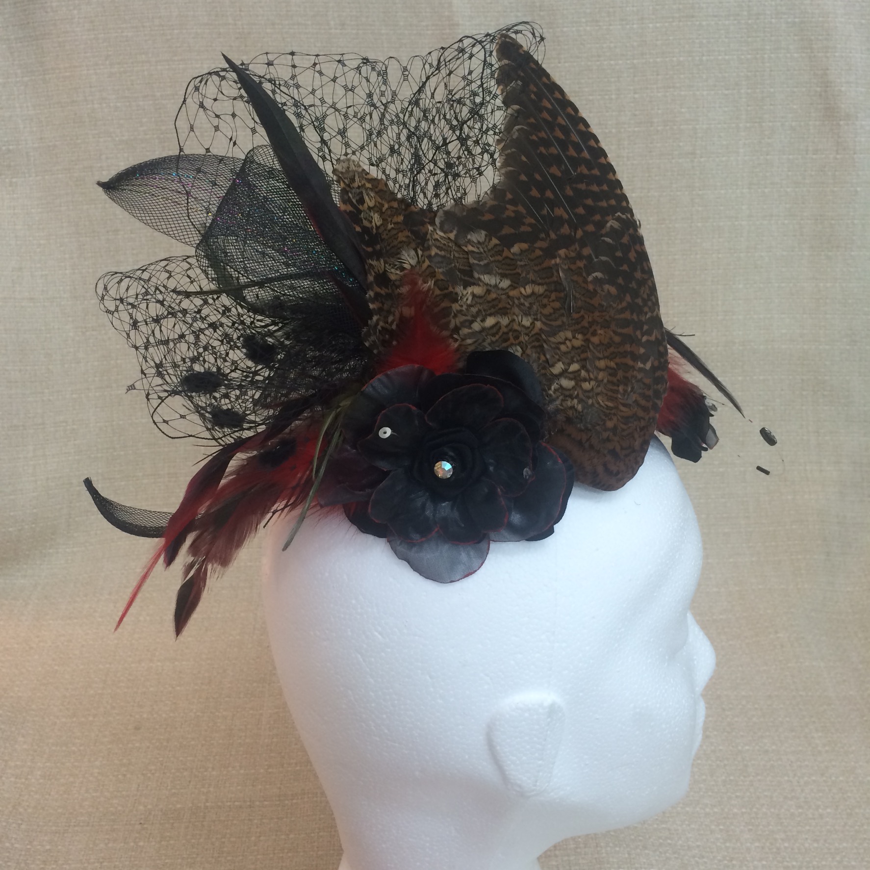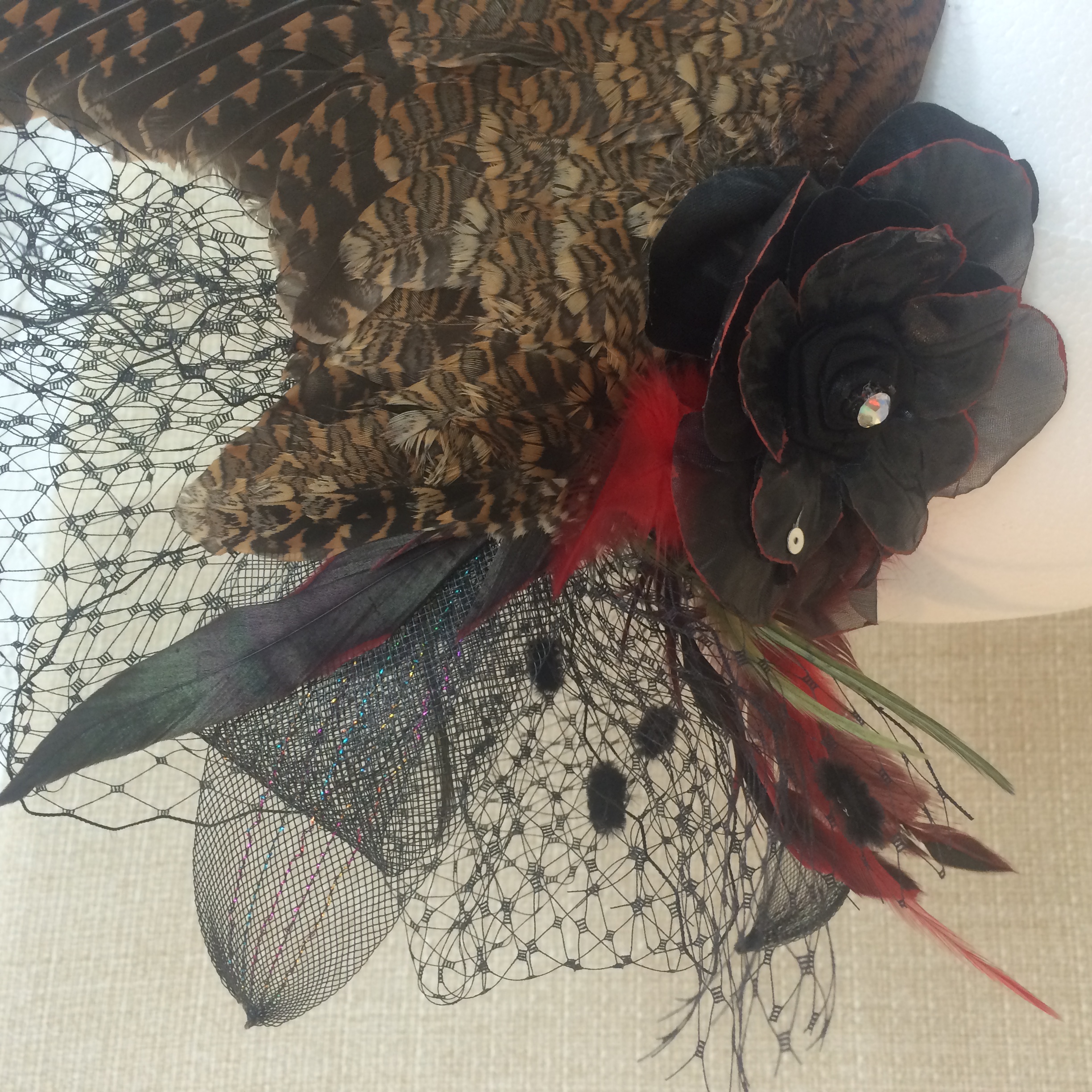 • Decorative flowers ( black with hand painted red age petals ), crystals, single cock feathers, motley gold brown pheasant wing.