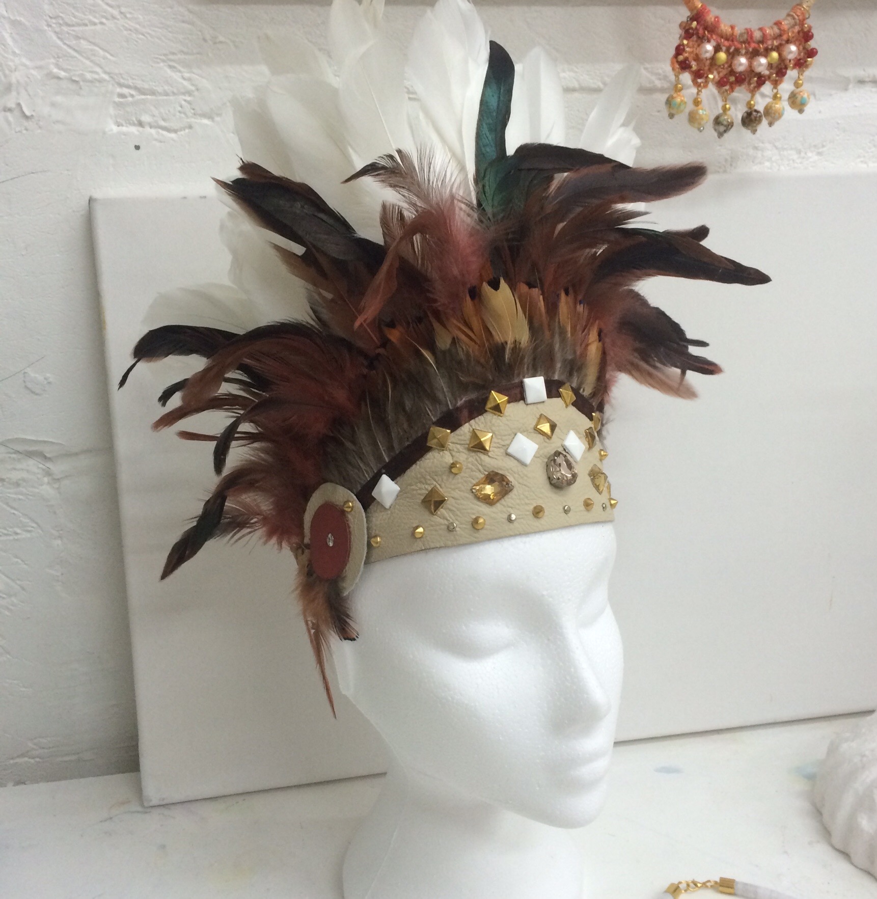 Made of dark brown genuine calfskin , chain details, brass studding, crystals, rooster feathers, pheasant feathers and ducks feathers.