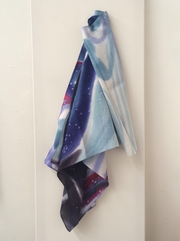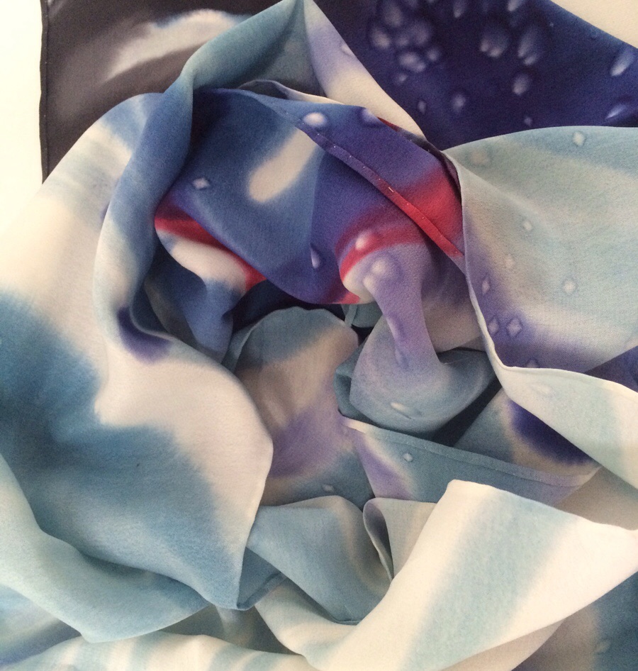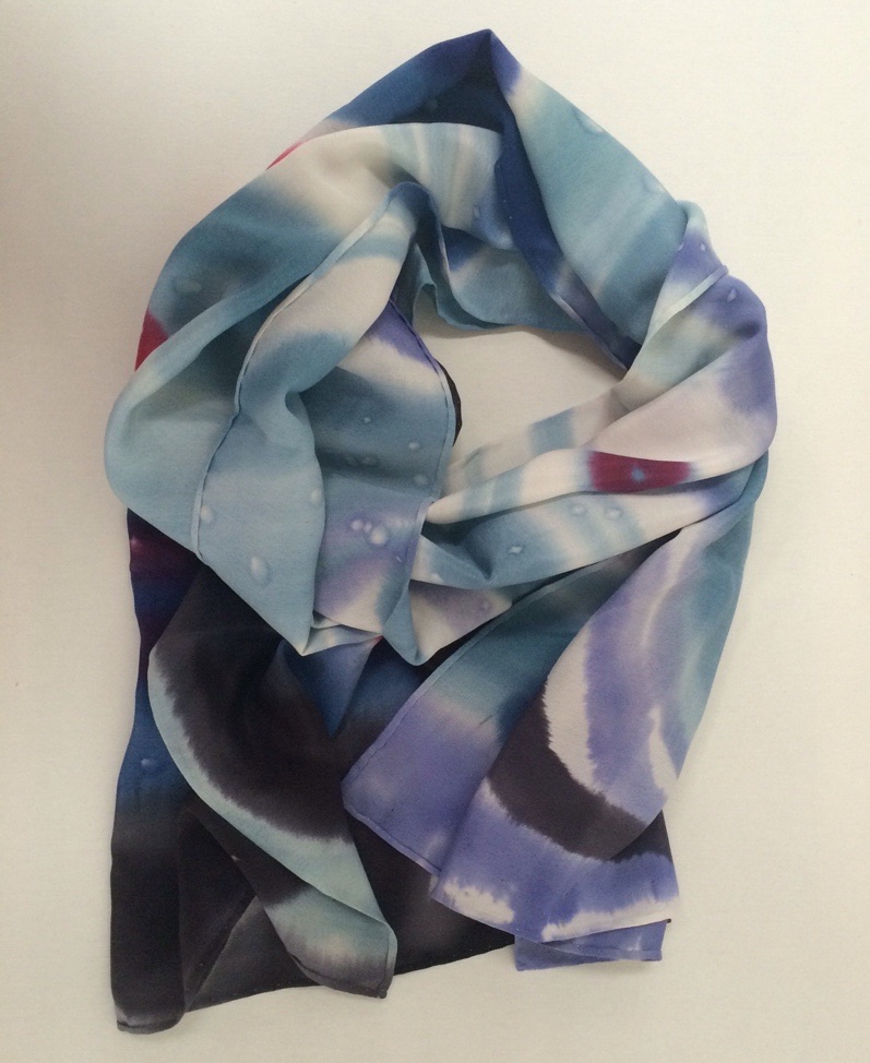 .This silk scarf is individually hand drawn, hand painted with brilliant permanent Russian dyes, wax removed with boiling water, steam fixed and after this long process, the silk scarf edges are hand rolled and sewn.