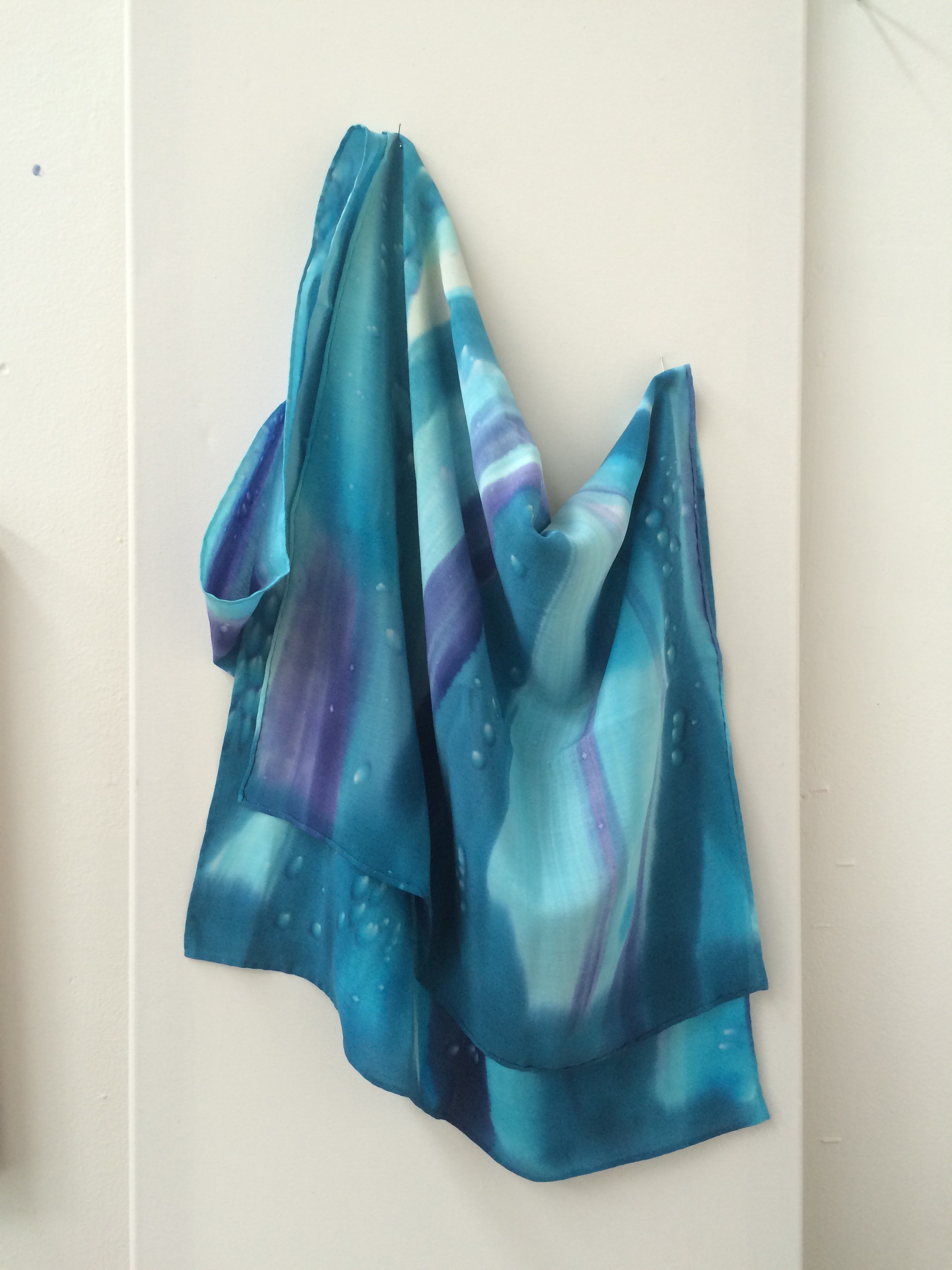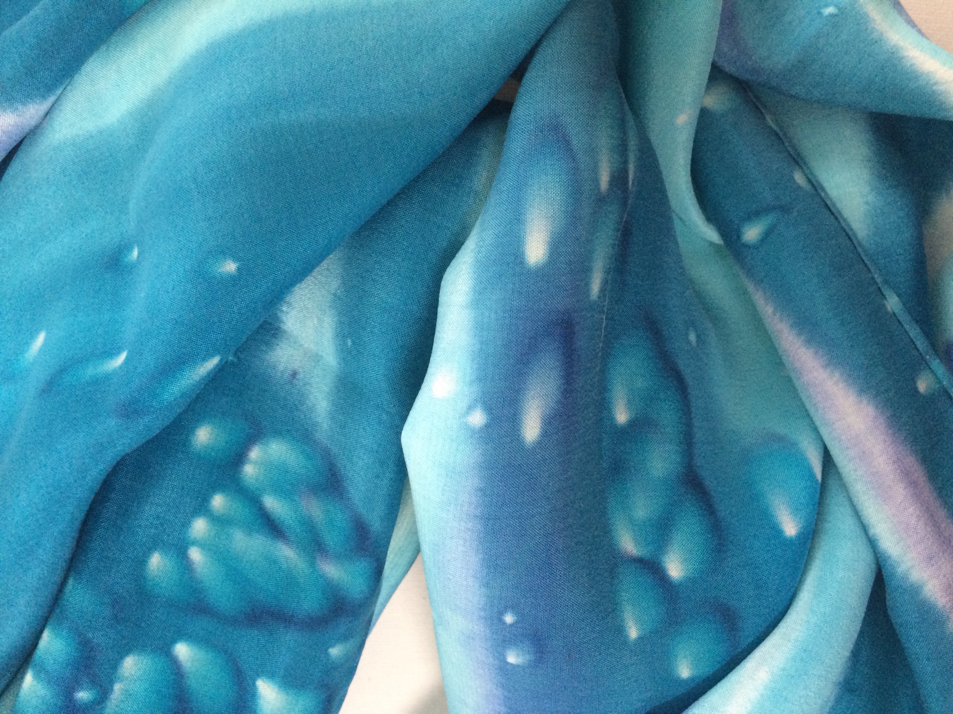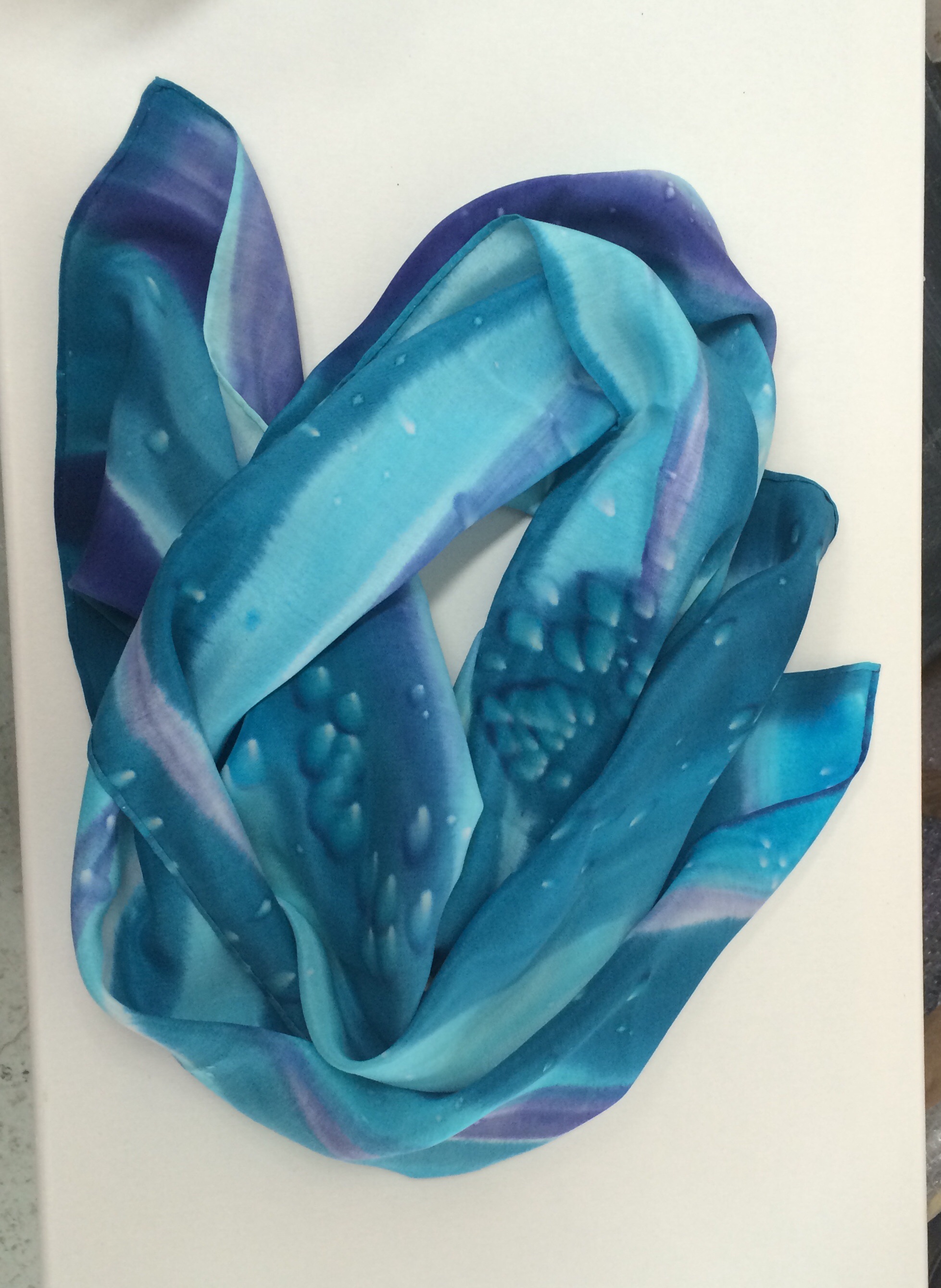 .   This silk scarf is individually hand drawn, hand painted with brilliant permanent Russian dyes, wax removed with boiling water, steam fixed and after this long process, the silk scarf edges are hand rolled and sewn.