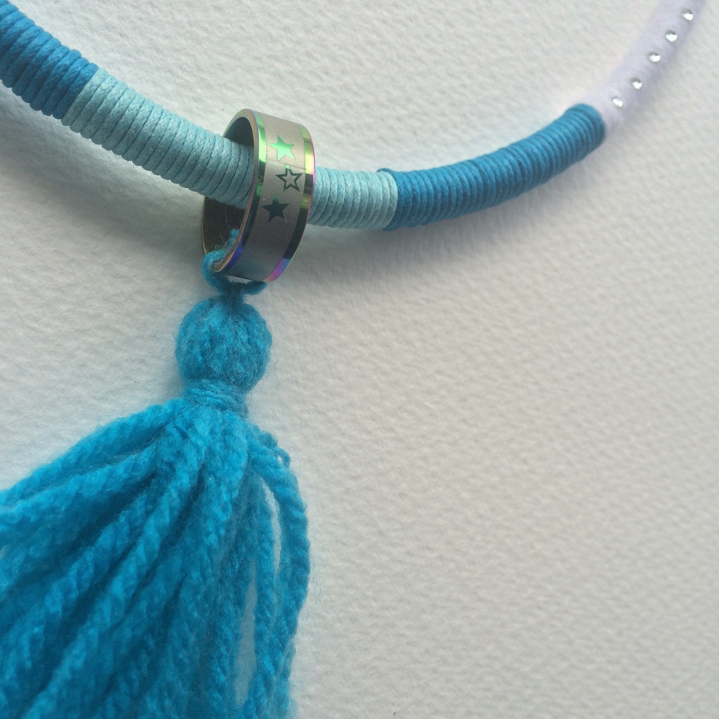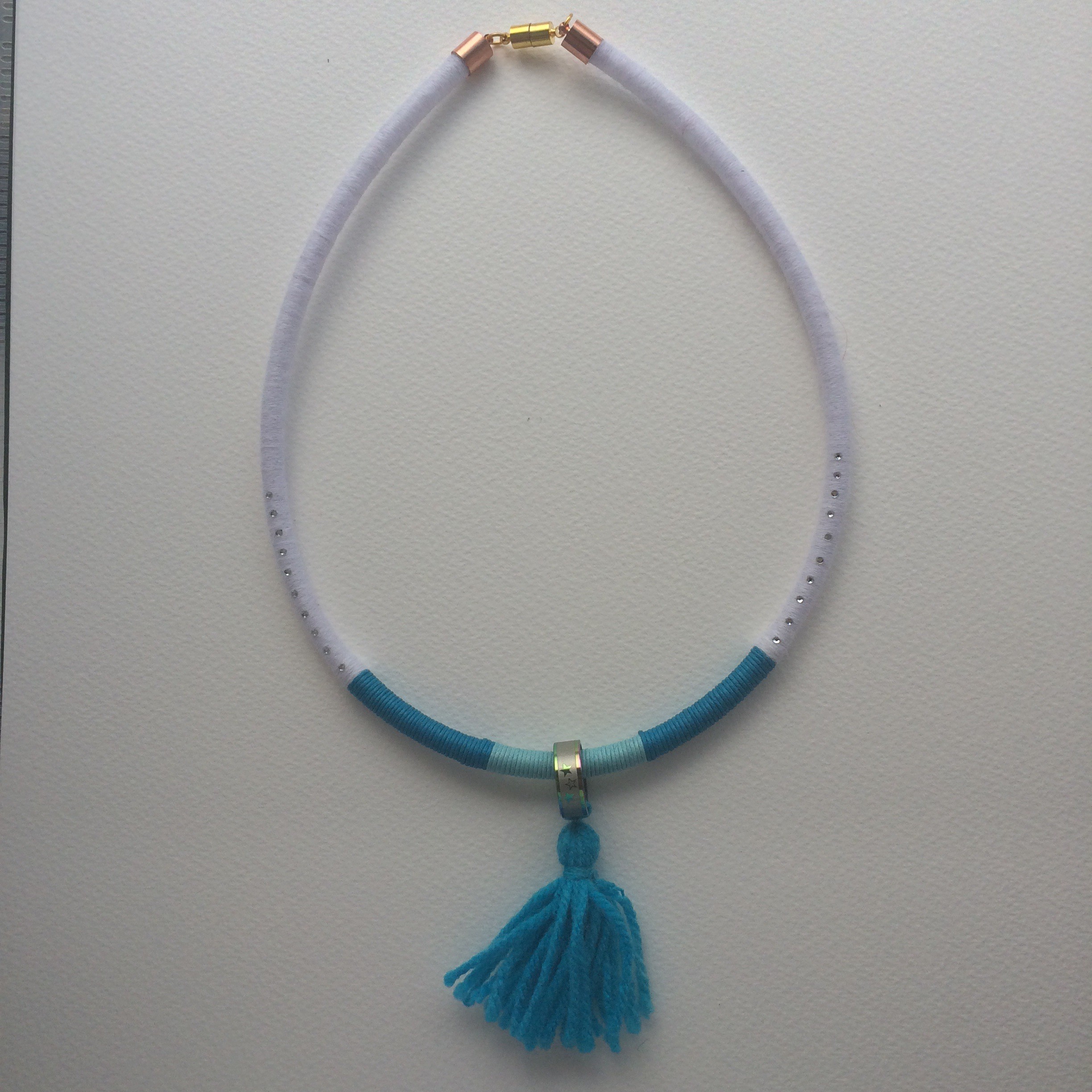 •Materials: wool, cotton, glue on crystals , cord, metal ring