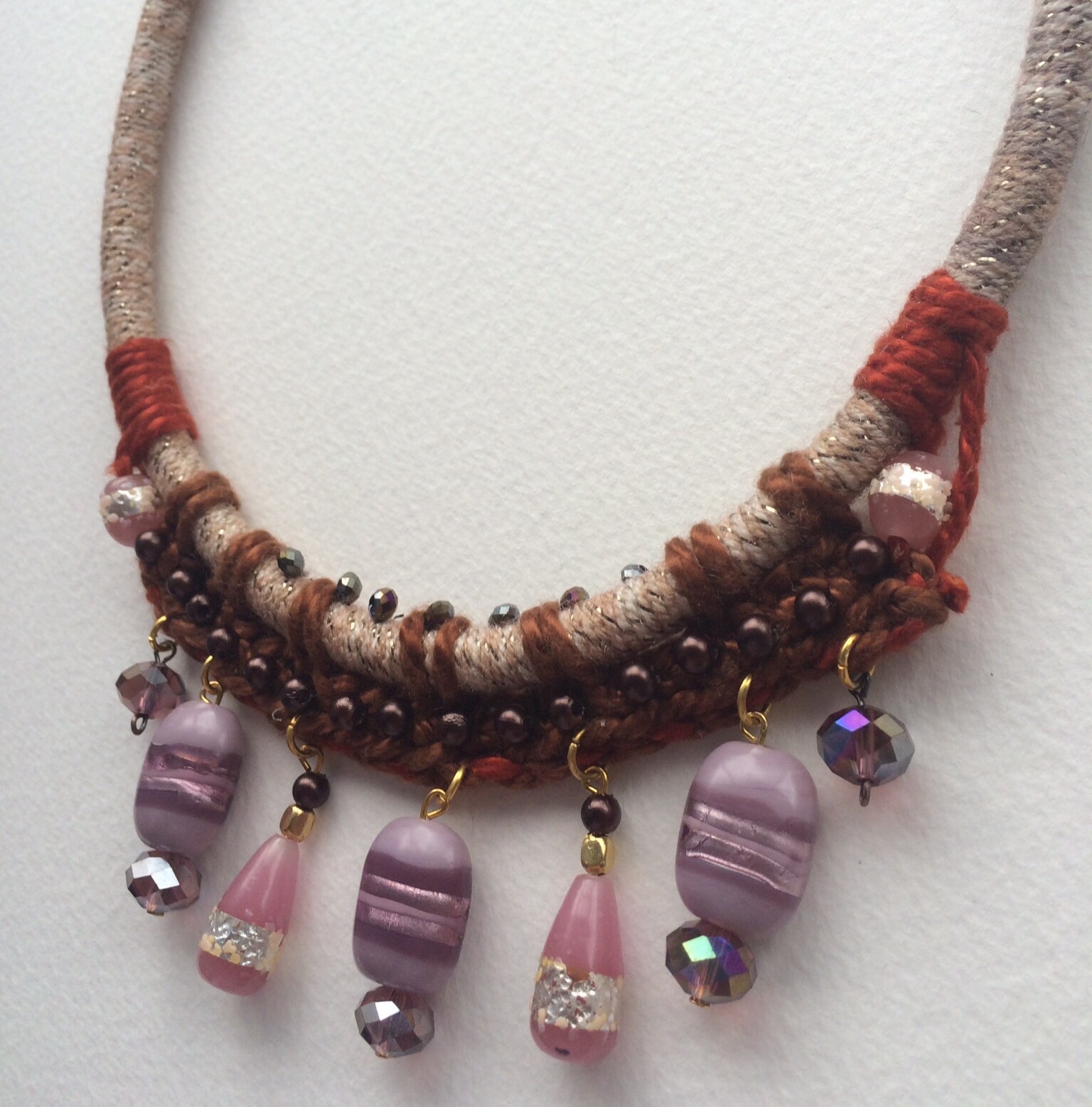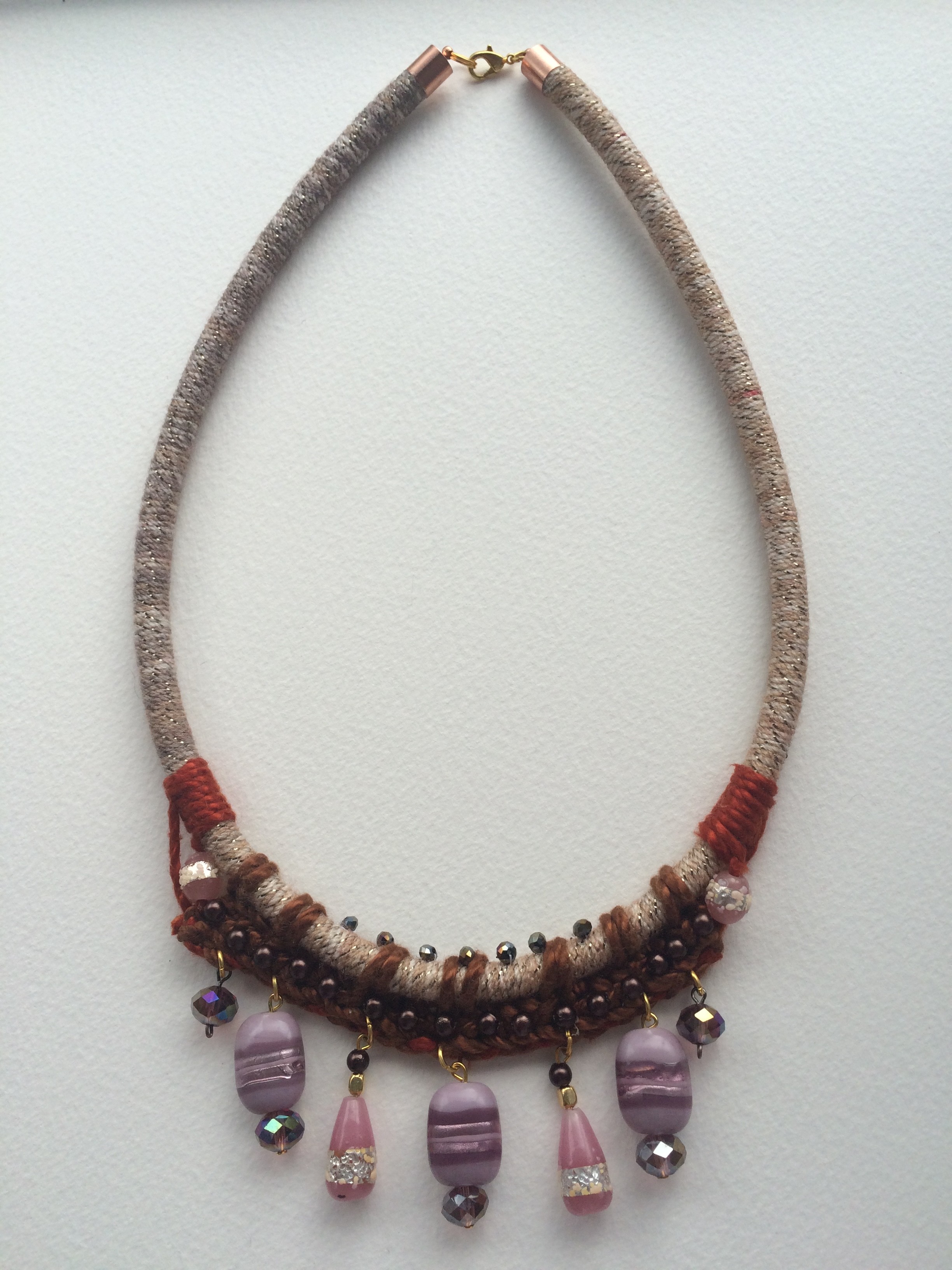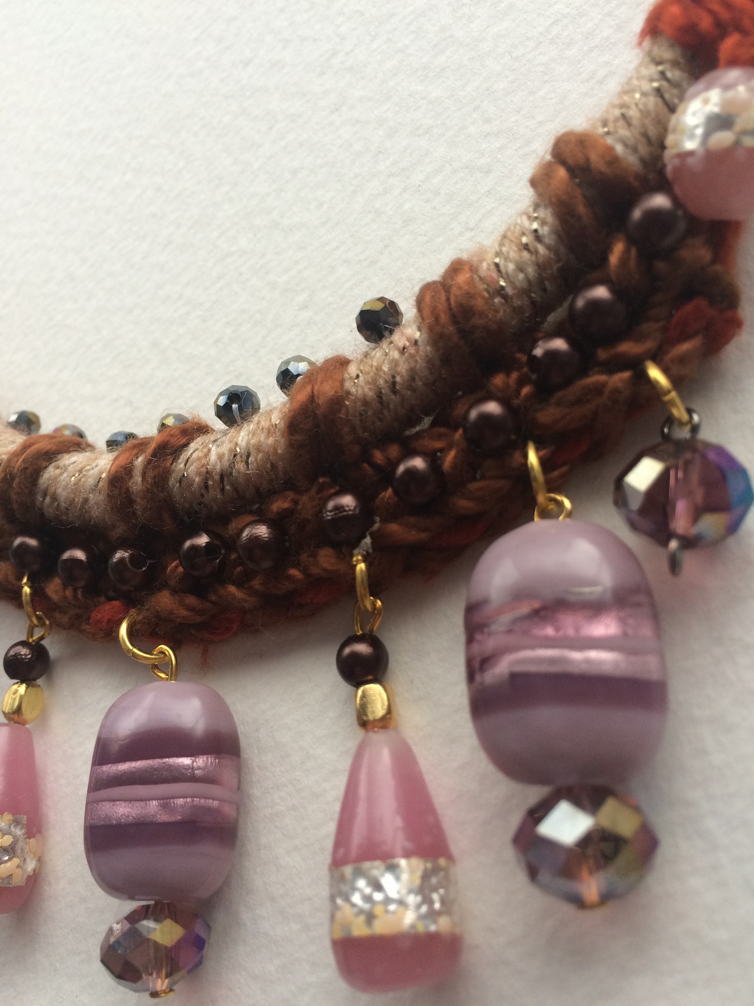 • Materials: wool, acrylic, silver foil glass beads, crystal beads, cord, metal beads, beads