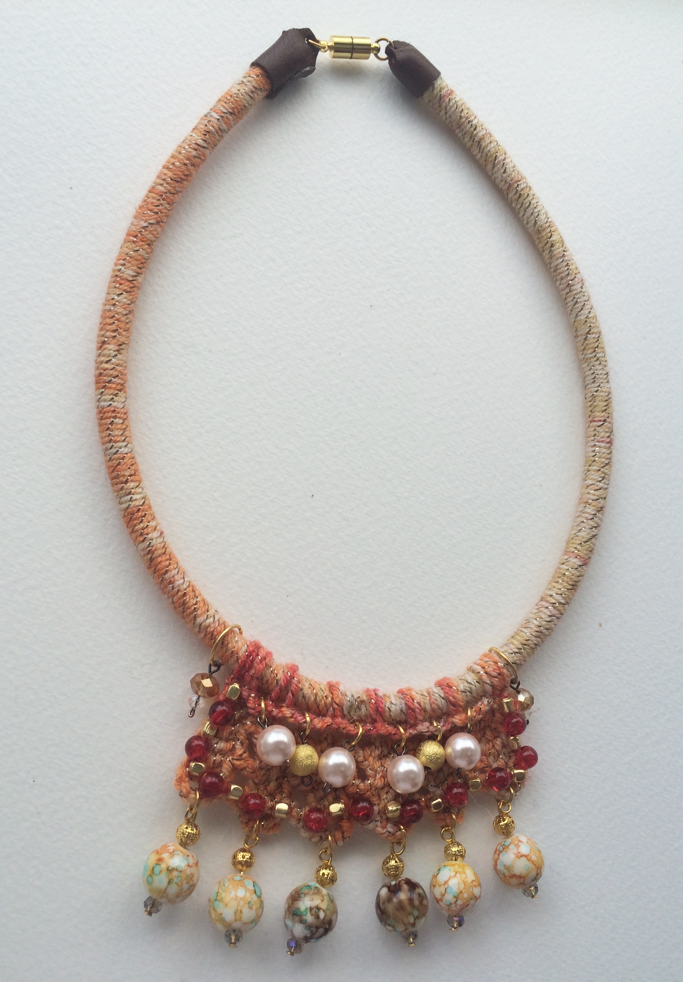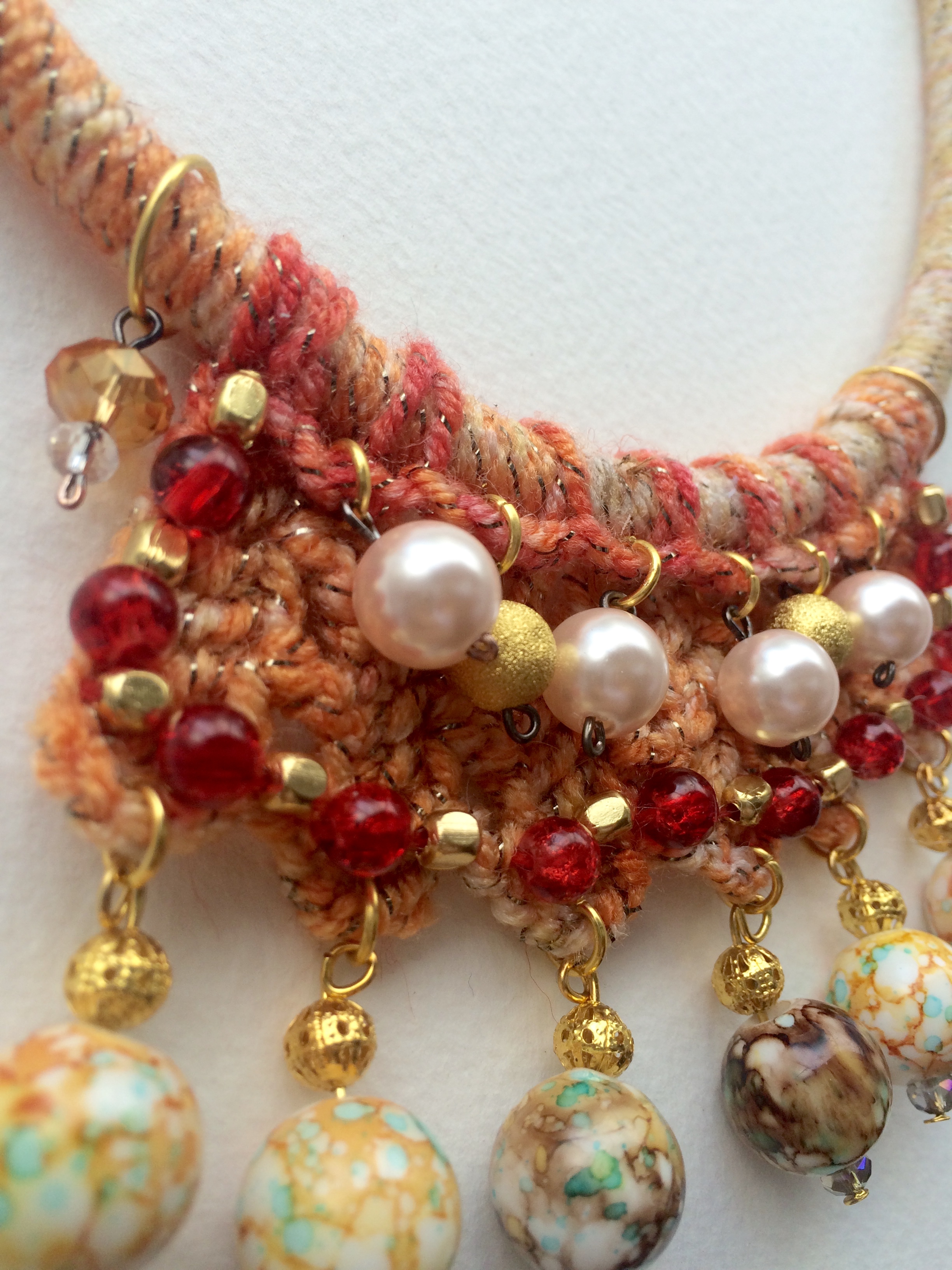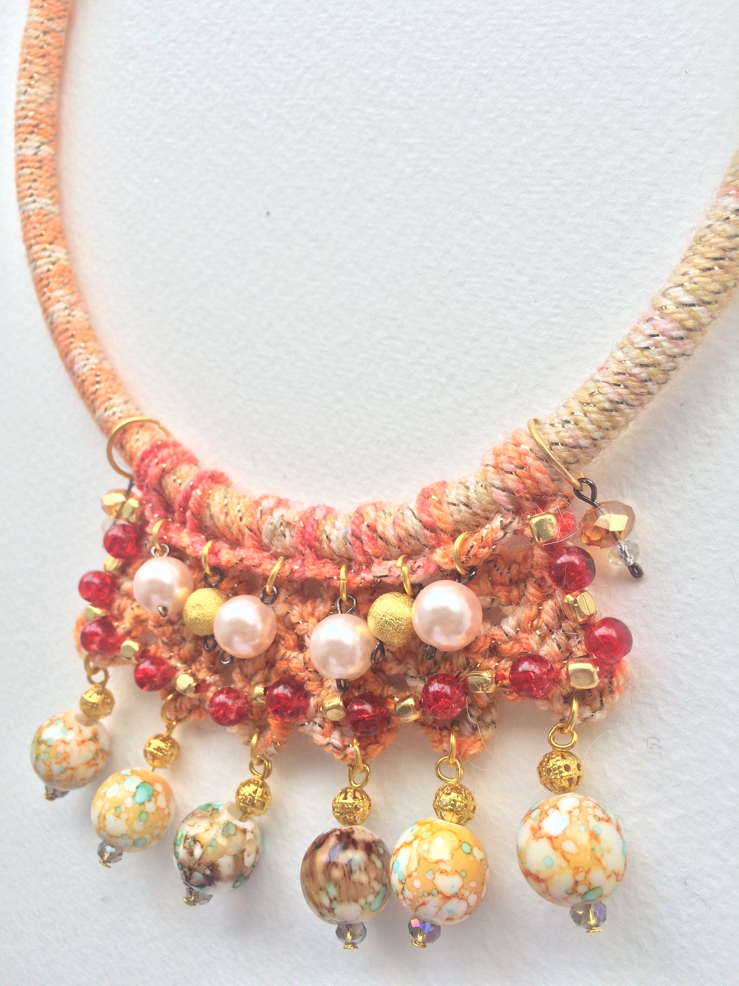 A masterpiece of craftsmanship, it combines metal Beads with colored crystals, Crystal Pearls, and  fibre wrapped  elements.