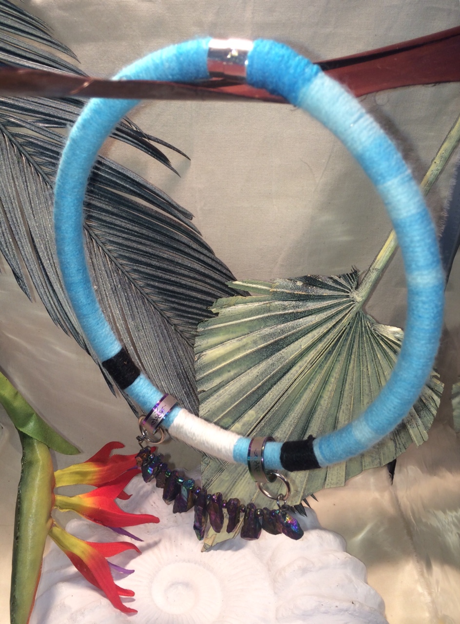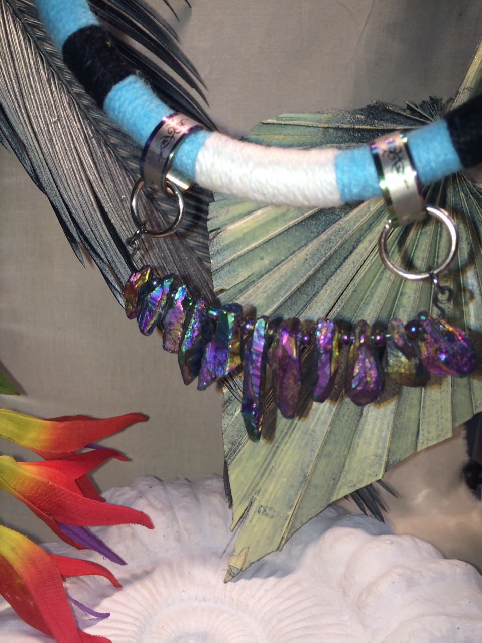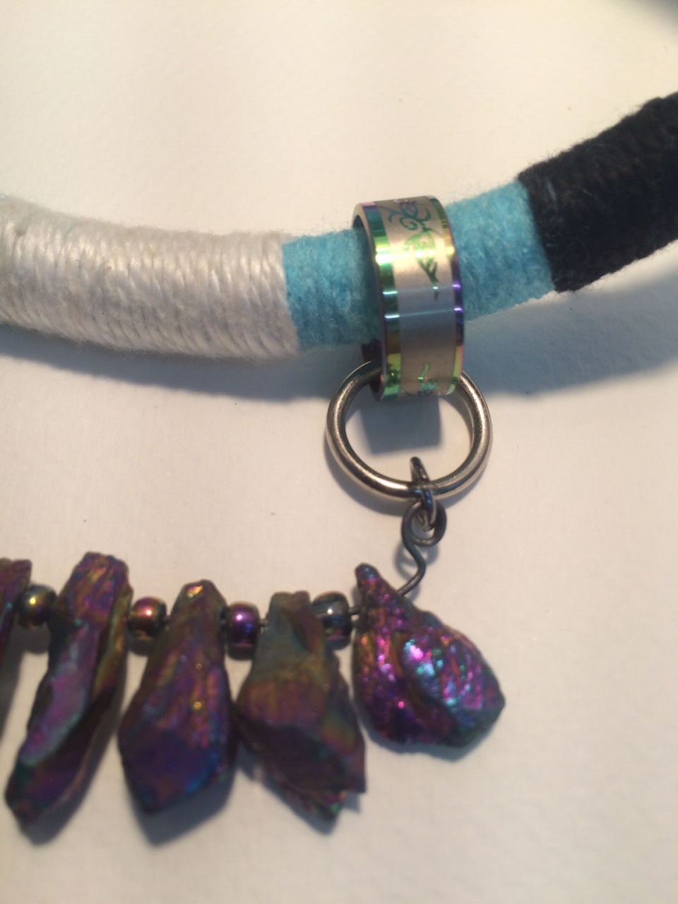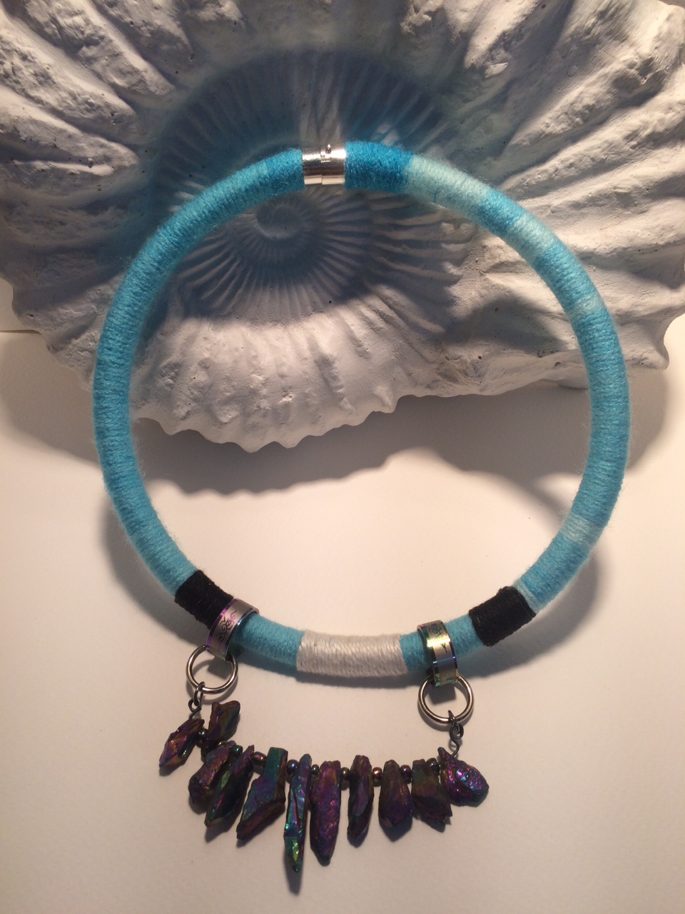 • Materials: wool, silk, titanium crystal druzy quartz gemstone, cord, metal rings, beads